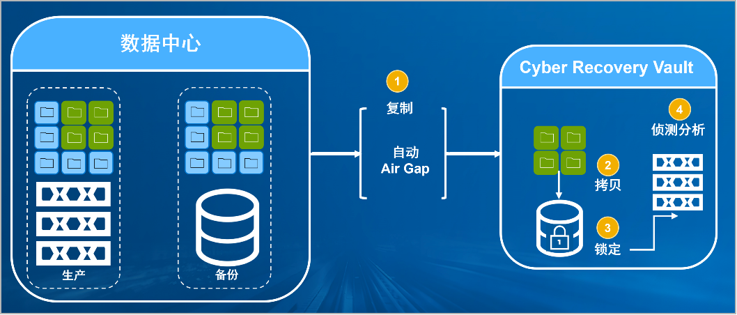 Trust钱包防勒索病毒方案将生产中心备份数据复制到Vault区,复制后网络自动断开实现弹性隔离。Vault区的数据快速拷贝,并对拷贝版本加锁(在锁定期数据不允许删除和修改)。Vault沙箱内对拷贝版本进行扫描分析,验证数据是否完好。